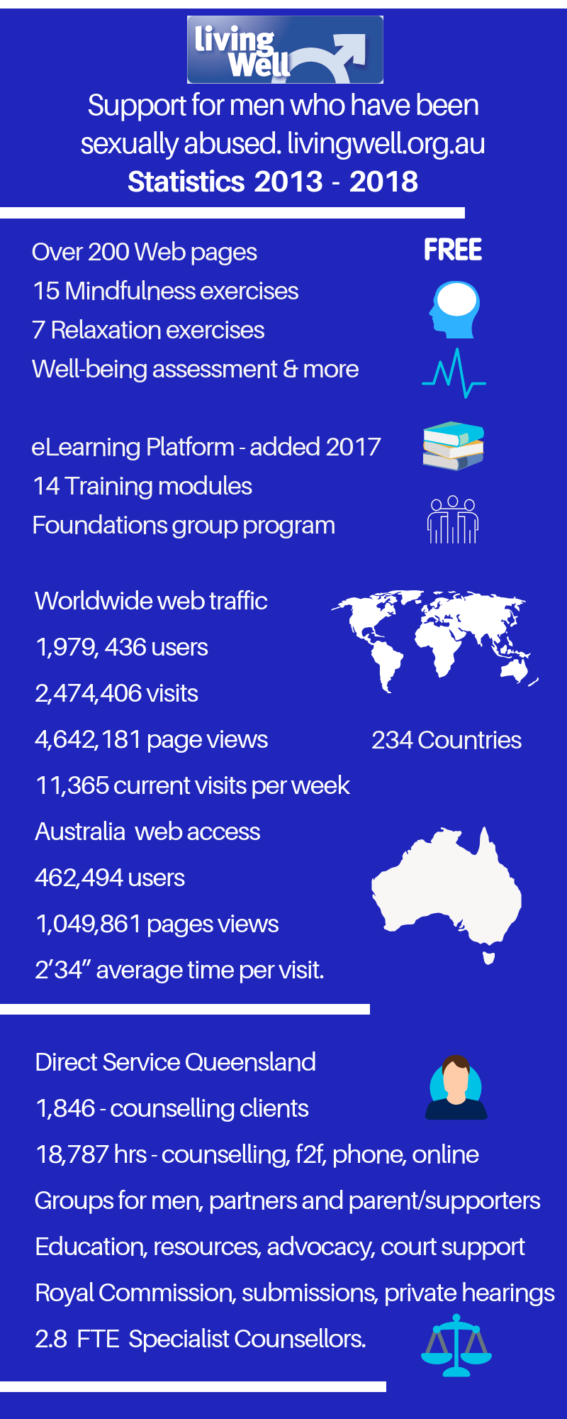 We like to see ourselves as the little engine that could and did. In 2013, www.livingwell.org.au was identified as a website of national significance to be archived in perpetuity by National Library of Australia Pandora Project. The below infograph provides a statistical snap shot of our service delivery over the past 5 years.